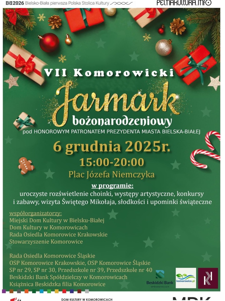 W sobotę, 6 grudnia, na Placu Józefa Niemczyka odbędzie się VII Komorowicki Jarmark Bożonarodzeniowy - jedno z najbardziej rodzinnych i klimatycznych wydarzeń w naszej dzielnicy. Od 15:00 do 20:00 mieszkańcy Komorowic, Bielska-Białej i okolic będą mogli wspólnie poczuć magię zbliżających się świąt.