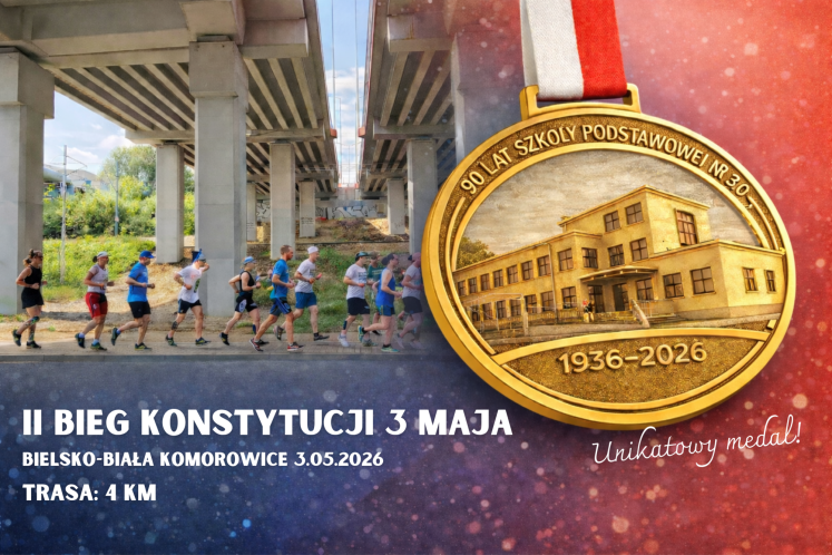 Zapraszamy na II Bieg Konstytucji 3 Maja, który odbędzie się 3 maja 2026 roku. Uczestnicy wydarzenia przebiegną około 4-kilometrową trasę ulicami Komorowic Krakowskich i Komorowic Śląskich. Trasa biegu wiedzie m.in. przez bieżnię Szkoły Podstawowej nr 30, która w tym roku obchodzi swoje 90-lecie. Z tego powodu na okolicznościowym medalu widnieć będzie wizerunek szkoły z 1936 roku.