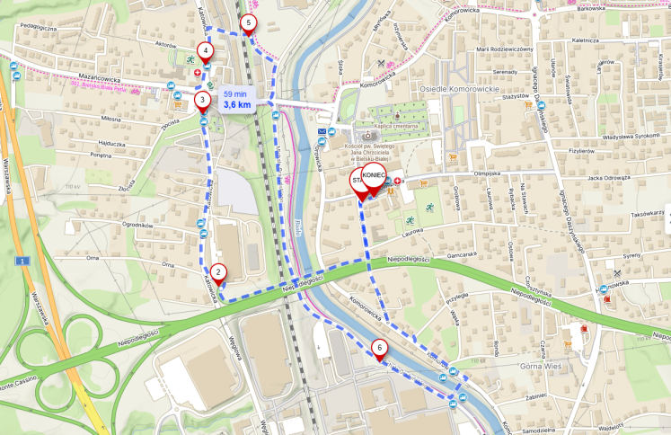 Trasa biegu: plac Niemczyka -> ul. Czereśniowa -> wiadukt na ul. Niepodległości nad rzeką Białą -> ul. Katowicka -> pętla na bieżni Szkoły Podstawowej nr 30 (przerwa na wspólne zdjęcie) -> ul. Katowicka -> ul. Konwojowa -> ul. Grażyńskiego -> ul. Komorowicka, ul. Czereścniowa -> plac Niemczyka.