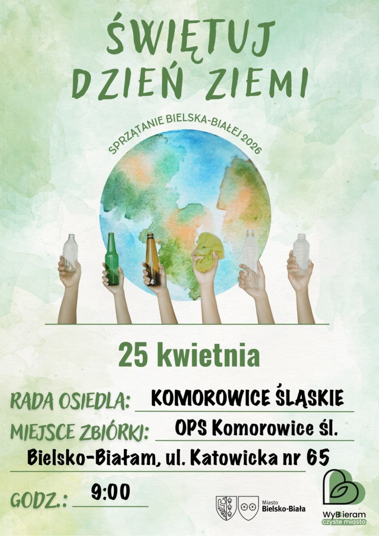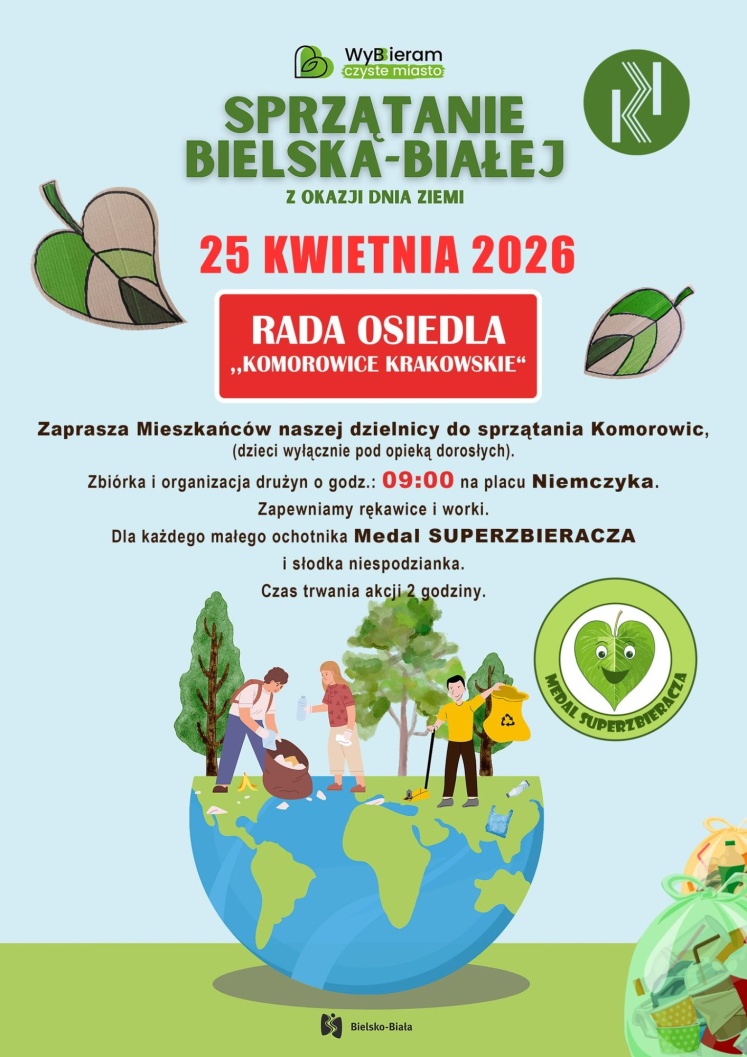 W sobotę, 25 kwietnia 2026 roku, mieszkańcy Komorowic Krakowskich i Komorowic Śląskich połączą siły podczas wspólnej akcji sprzątania z okazji Dnia Ziemi. To dobra okazja, by zadbać o najbliższe otoczenie, a przy okazji zrobić coś wartościowego dla swojej dzielnicy i lokalnej społeczności.